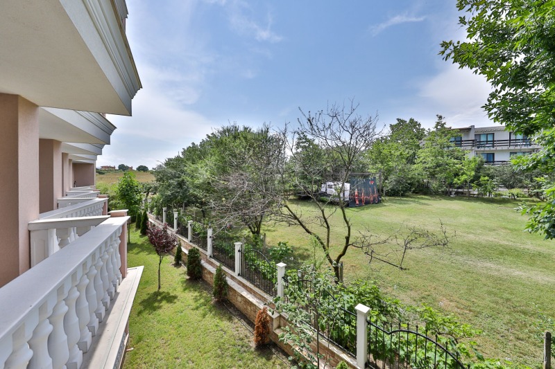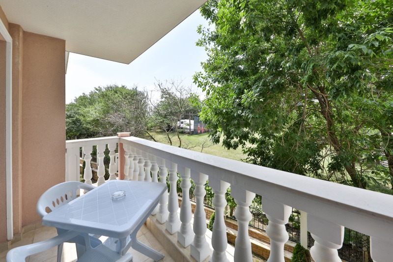 Апартаментът има просторна тераса с красива гледка към зеленината на курорта.