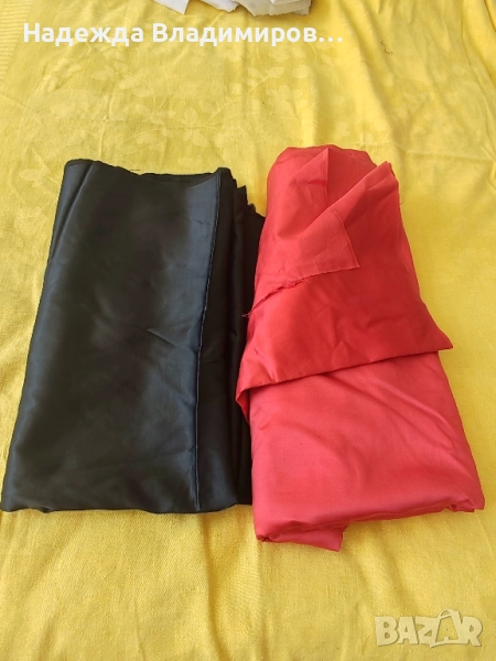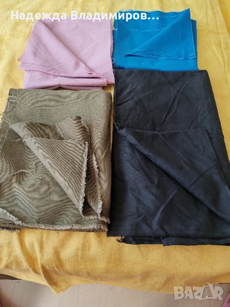 Продавам чисто нови плтове от социализма. Снимка 1-сиво тривирено букле-дължина194 см., ширина 160 см. - 15 лева. Снимка 2-дефтин(памук 100%) на бял фон сини мотиви,дължина 280 см., ширина 84 см-7 лева.Снимка 3 - черен брилянт(червения е продаден) -дължина 165 см., ширина 70 см. - 8 лева.Снимка 4 -червен фин вълнен плат, цвета е между малина и пламък, дължина 200 см., ширина 140 см. - 9 лева.Снимка 5 -тъмно син фин вълнен плат, дължина 200 см., ширина 140 см. - 9 лева.Снимка 6 -полупрозрачни тривирено, подходящ за кърпа за глава-144 см/104 см.-6 лева. Снимка 7 -лилаво хасе - 150см./90см.-5 лева.;син плътен плат-150см/75см.-7 лева.;брезент-105 см. / 85 см. - 5 лева. ;тъмно синьо хасе - 152 см. /70 см. - 5 лева. И на последната снимка-две еднакви парчета тюлен лъскав плат, 320/70см.,двете за 7 лева.