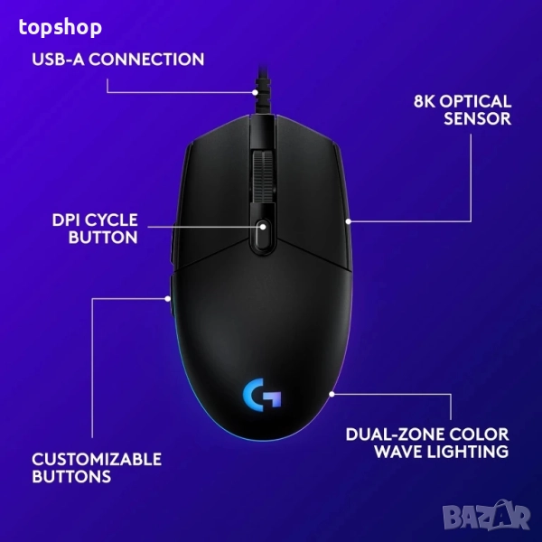 НОВА, тествана геймърска мишка Logitech G203 LightSync с кабел, 8000 DPI, Rainbow Optical Effect...