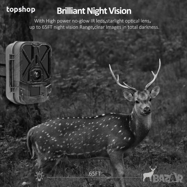 Ясно нощно виждане и скорост на освобождаване 0.3】 Този детектор за движение с нощно виждане за диви животни е оборудван с невидими инфрачервени LED светлини 940nm, а инфрачервеният сензор осигурява видим ъгъл на откриване от 120°. След като бъде засечено движение, камерата за проследяване се задейства за 0.3 секунди. Разстоянието на активиране може да достигне 20 метра (65 фута) и вълнуващите моменти могат да бъдат заснети ясно дори в тъмната нощ.
