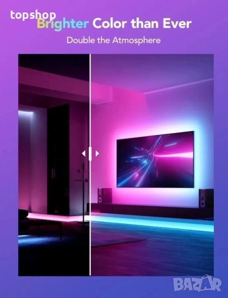 По-ярка от всякога: С 60 светодиода/м², Govee M1 има по-висока плътност от повечето RGBIC LED ленти. LED лентите Govee M1 осигуряват два пъти по-голяма яркост в лумена от по-старите поколения, за по-силна и по-последователна атмосфера в декора на стаята.