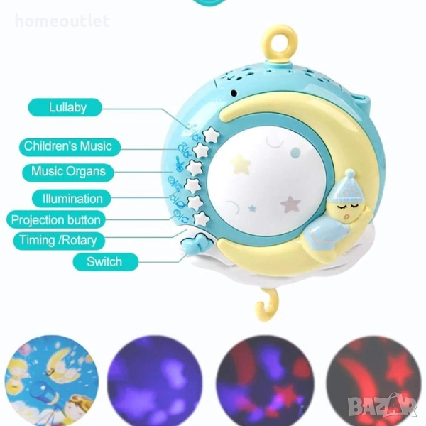 Съчетание от нежна музика, успокояваща проекция и весели играчки прави този мобилен аксесоар идеален за приспиване, забавление и ранно развитие.