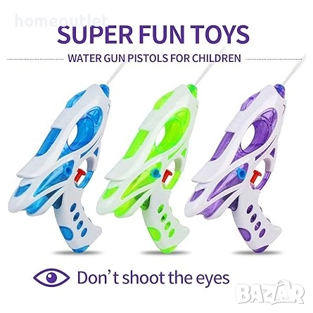 Комплект от 3 водни пистолета в различни цветове: син, зелен и лилав.