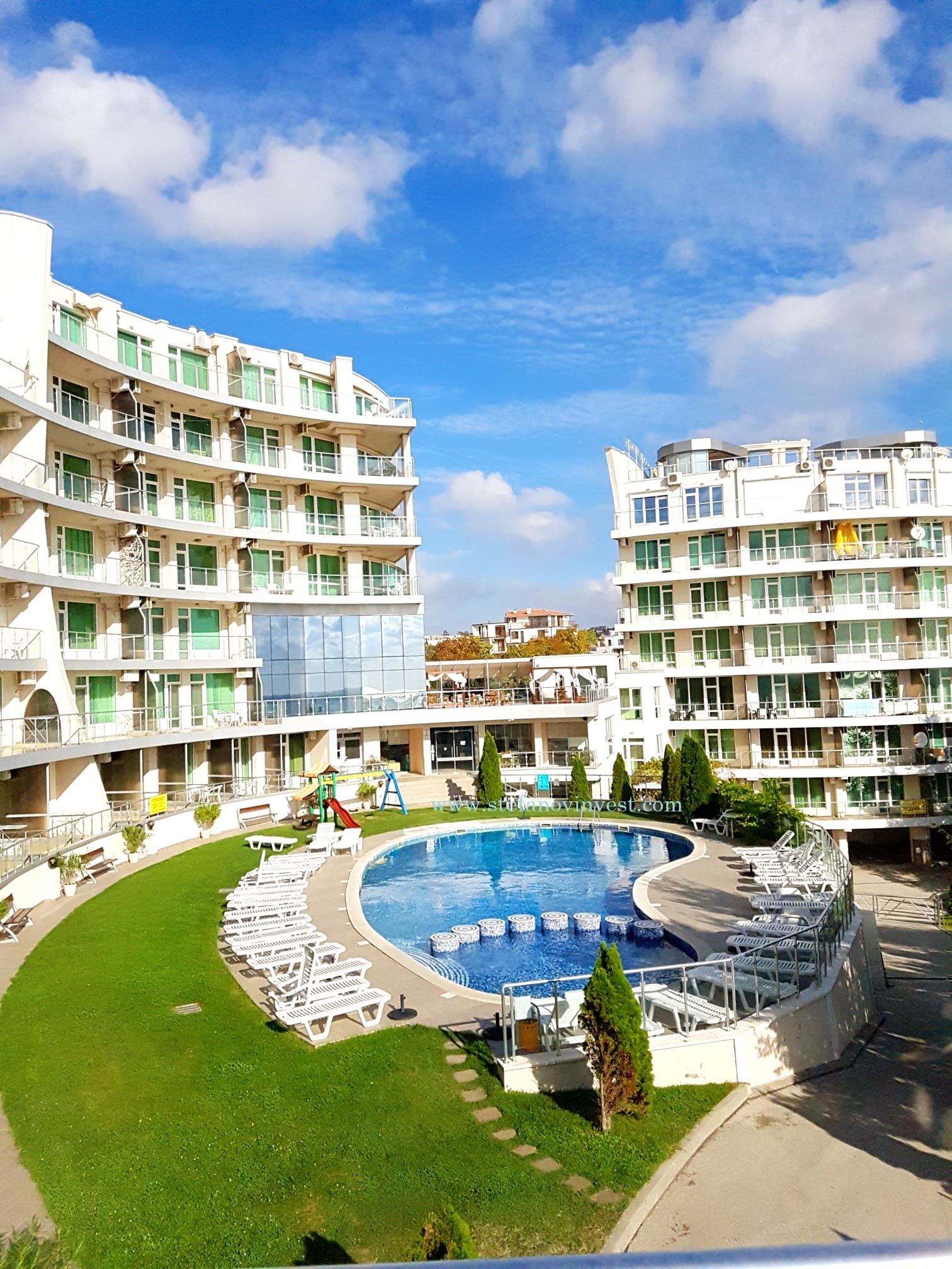 Комплексът има два басейна, фитнес зала, няколко магазина в непосредствена близост.