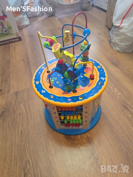 Функции: Включва елементи като лабиринт за мъниста, сметало, сортер за форми и вероятно долно ниво с игра "Не се сърди, човече" (Ludo).