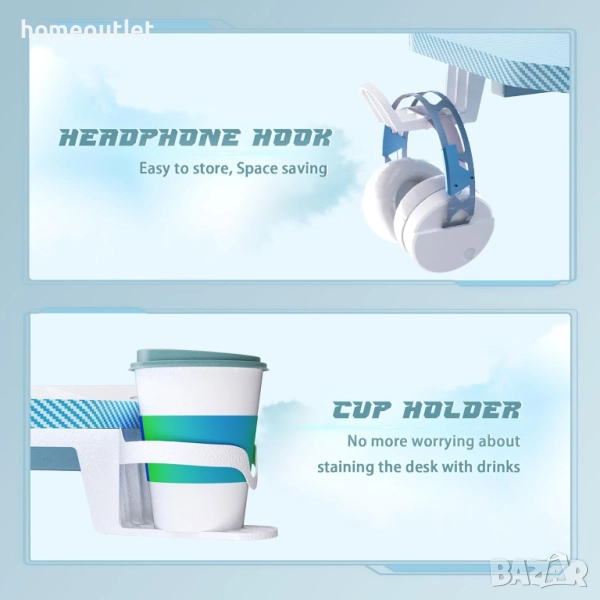 Включени са поставка за чаша и закачалка за слушалки – сменяеми в зависимост от вашите предпочитания, така че всичко необходимо да е винаги под ръка.