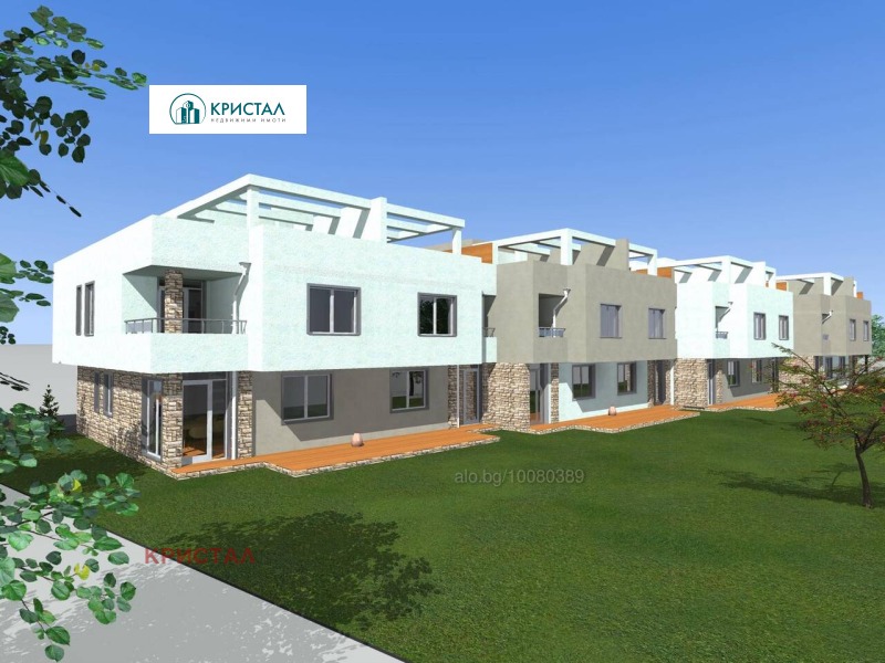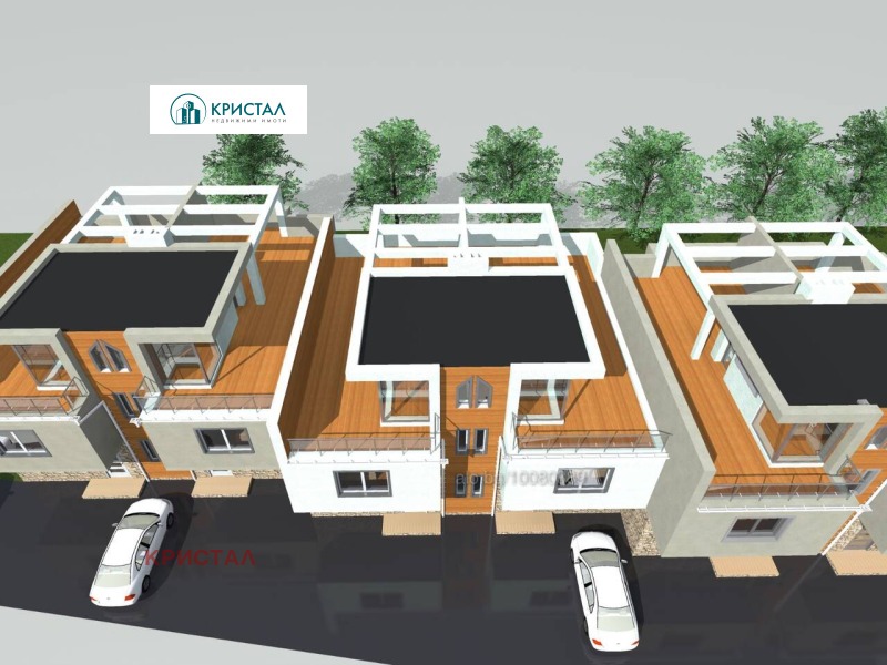 Оф.29971 Агенция 'Кристал' предлага на Вашето внимание, масивна, редова,двуетажна къща с РЗП от166,8м2, с двор от 54м2 и две паркоместа. Пътви етаж е с голяма всекидневна с кухня, санитарен възел и веранда. Втори етаж е с 3 спални с два санитарни възела и тераса. Има и покривна тераса от 60м2. Имотът е в начален строеж. Очаква се акт 14 през май 2026, а акт 16 до края на 2026г. -Оказваме пълно съдействие за банково кредитиране, при най-добри условия и цялостна юридическа проверка на имотите, които предлагаме !