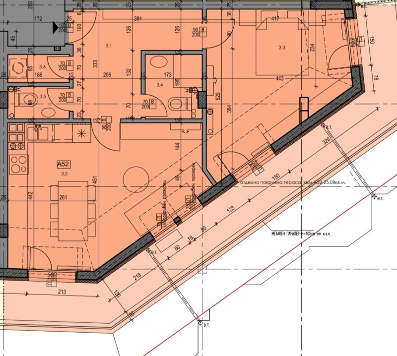 Апартамент А52 се намира на седми етаж в тухлена сграда с ТЕЦ, площ от 104.50 кв.м.