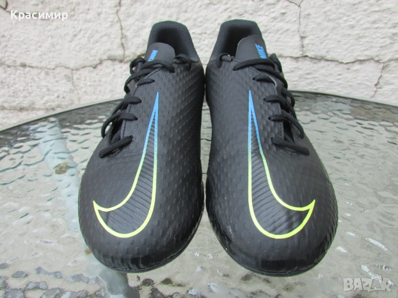 Футболните обувки Nike Phantom GT Academy FG, проектирани за игра както на естествени, така и на изкуствени повърхности. Горната част е изработена от дишащ материал Flyknit, осигуряващ отлична опора и прилягане към крака, а гъвкавата и структура гарантира комфорт при интензивна употреба. Технологията All Conditions Control (ACC) в обувките е за оптимално усещане за топката при различни условия, с асиметрично връзване, увеличаващо контактната повърхност с топката и подметка с шипове за стабилност и отлично сцепление. Номер 38,5 с дължина на стелката 24 см. Произведени във Виетнам.