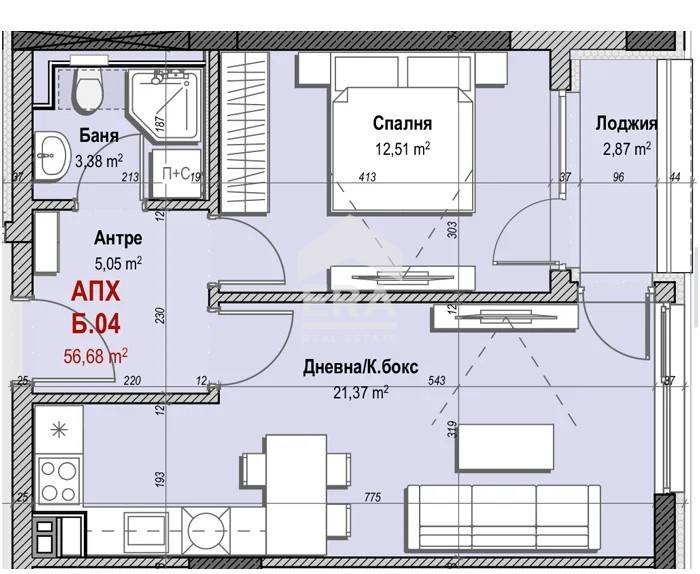 Представяме на вашето внимание двустаен апартамент 4 в сграда Б, включващ светла дневна с кухненски бокс, спалня, баня с тоалетна, антре и лоджия.