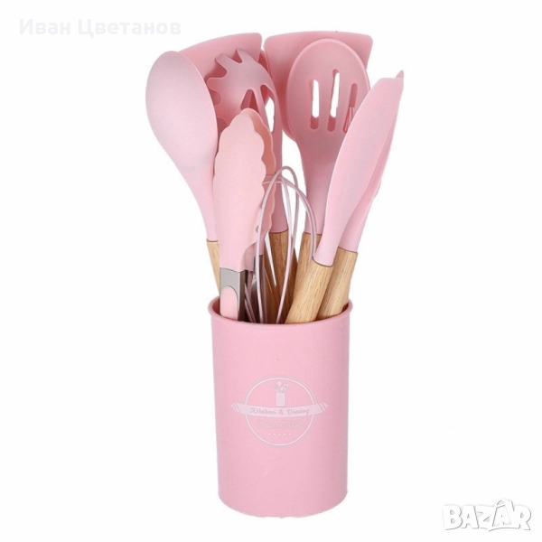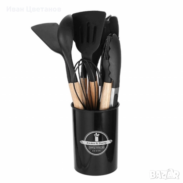Комплекта кухненски прибори съдържа: 1 х лъжица за готвене, 1 х решетъчна лъжица, 1 х шпатула, 1 х решетъчна шпатула, 1 х черпак, 1 х бъркалка, 1 х щипки, 1 х четка за намазване, 1 х лъжица за паста, 1 х малка шпатула, 1 х кръгла поставка за приборите;