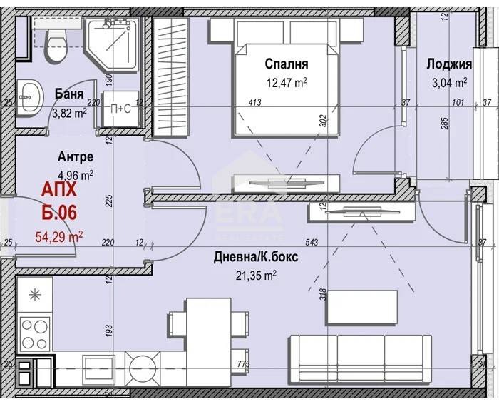 Представяме на вашето внимание двустаен апартамент 6 в сграда Б, включващ светла дневна с кухненски бокс, спалня, баня с тоалетна, антре и лоджия.