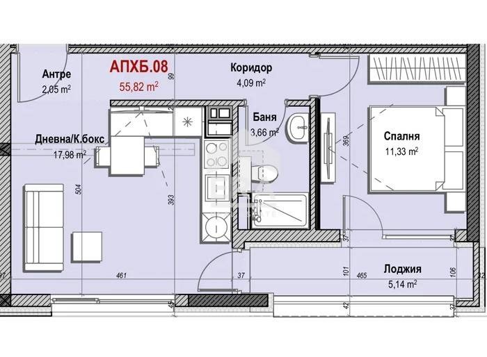 Представяме на вашето внимание двустаен апартамент 8 в сграда Б, включващ светла дневна с кухненски бокс, спалня, баня с тоалетна, коридор, антре и лоджия.