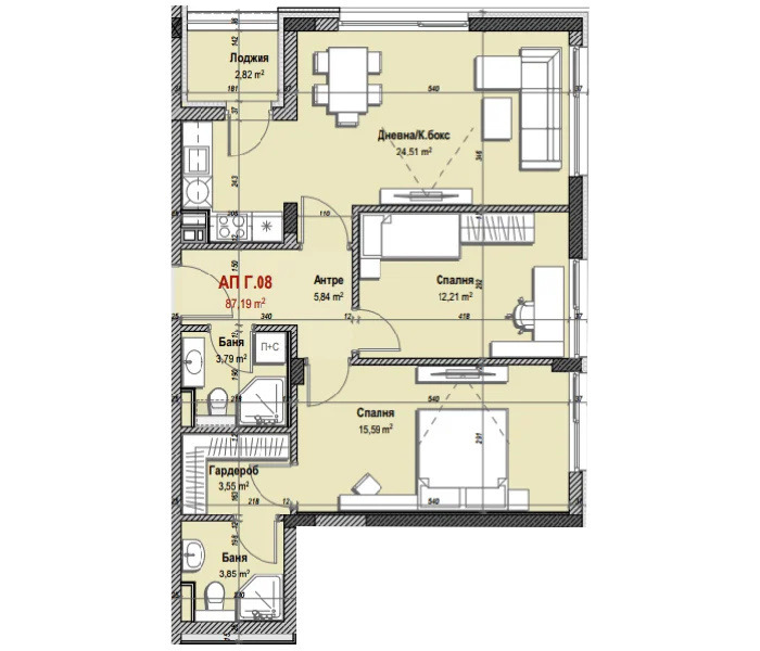 Представяме на вашето внимание тристаен апартамент 8 в сграда Г, включващ светла дневна с кухненски бокс, две спални, две бани с тоалетна, антре, лоджия и склад.