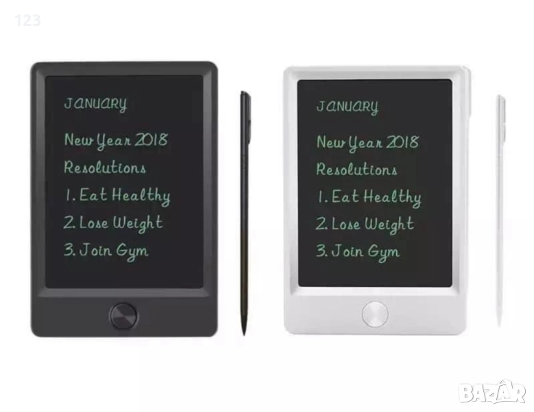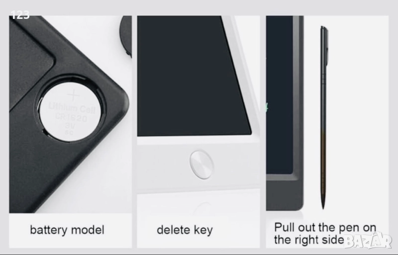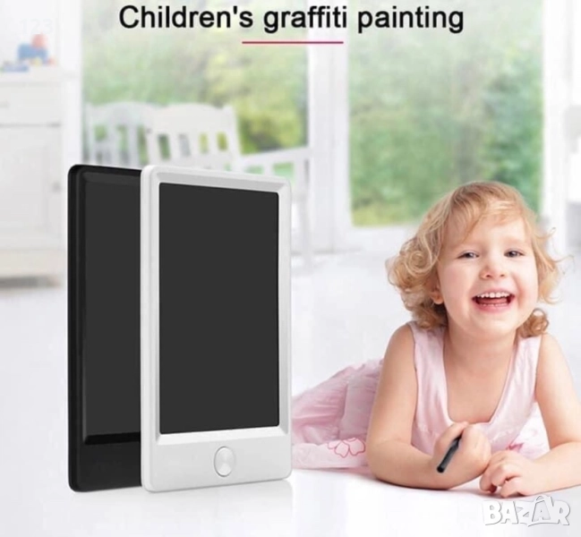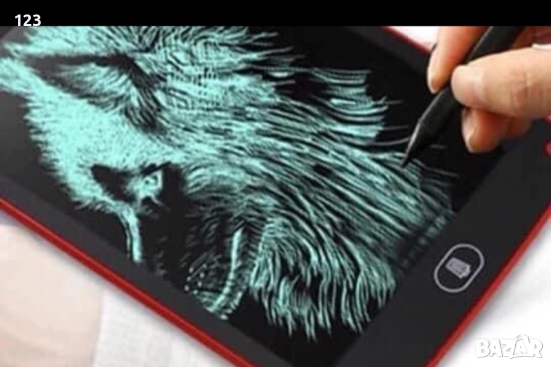 Таблет за рисуване на батерия. Идва със стилус (писалка) за рисуване. Компактен и удобен размер – посочен е на снимката. Налични са само черни бройки. За малки деца…