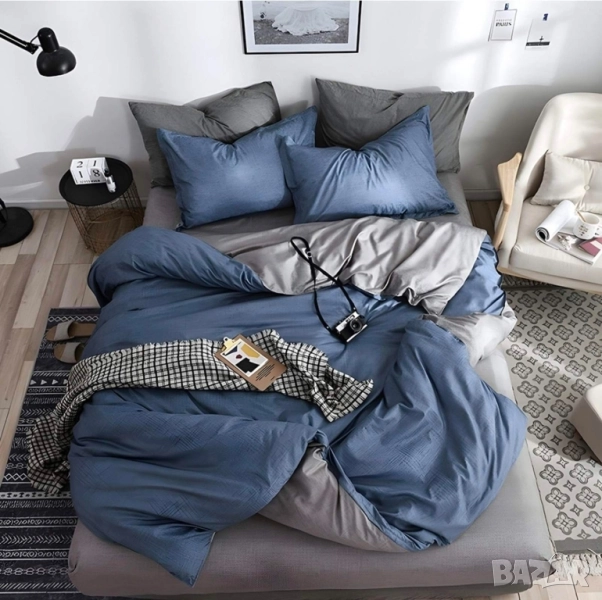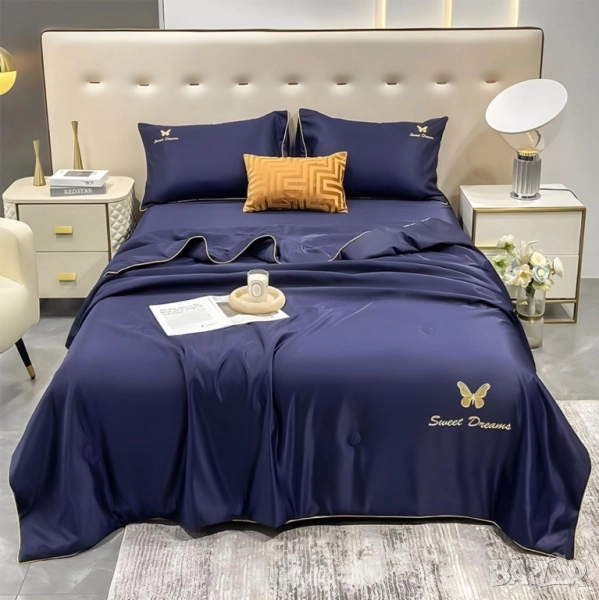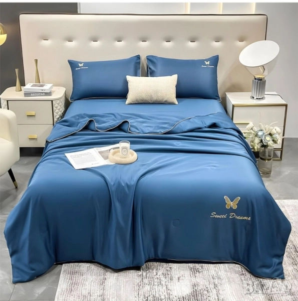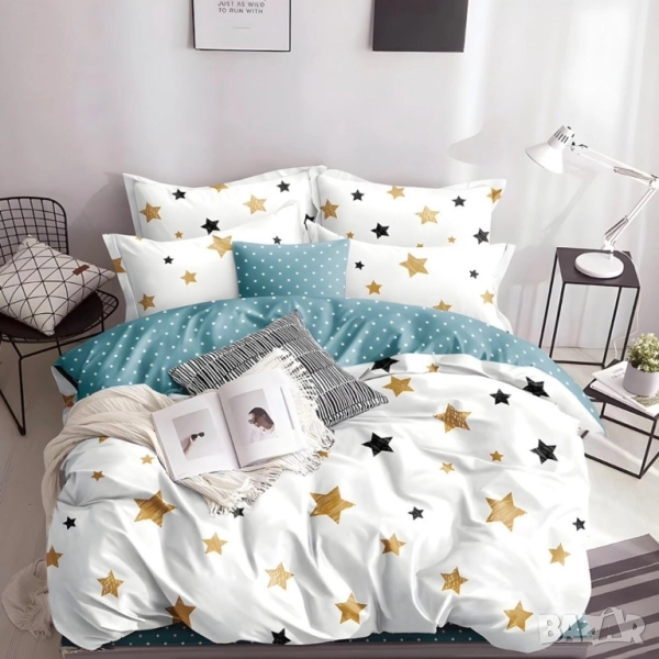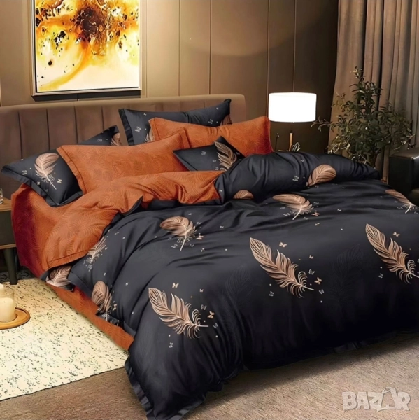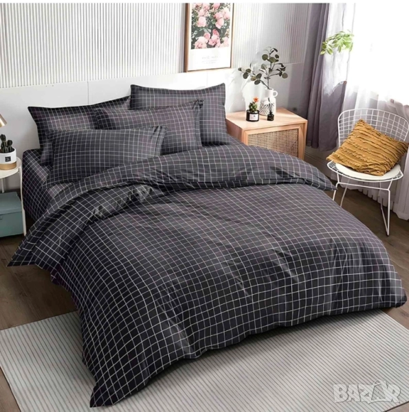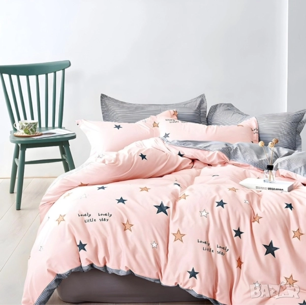 4 части с олекотена завивка Материя: 100% полистер Размери: долен чаршаф 220*230 без ластик Олекотена завивка 200*230 2 бр калъфки 50*70. Цена: 99лв