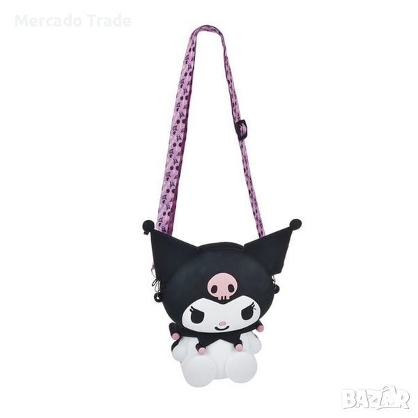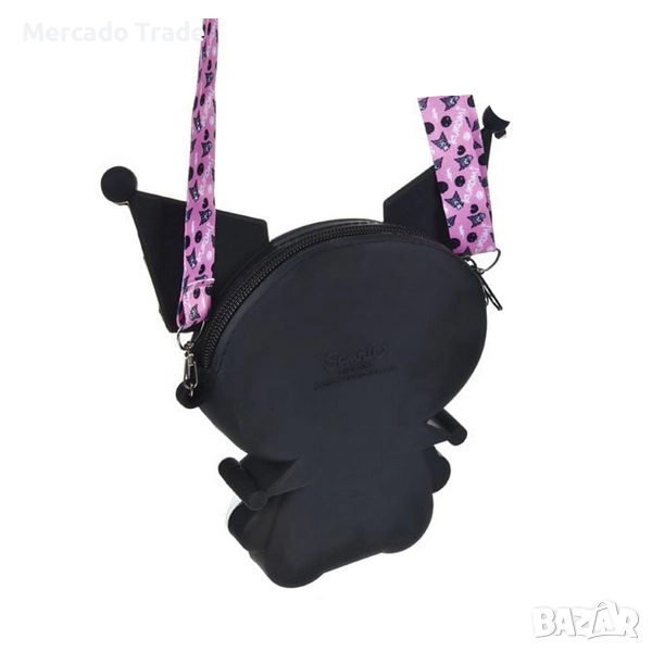 Силиконова чанта за момичета в черен-бял цвят с дизайн KUROMI, с розова регулируема многоцветна презрамка 49 см с дизайн KUROMI, която се завързва с метални кукички за носене през рамо.