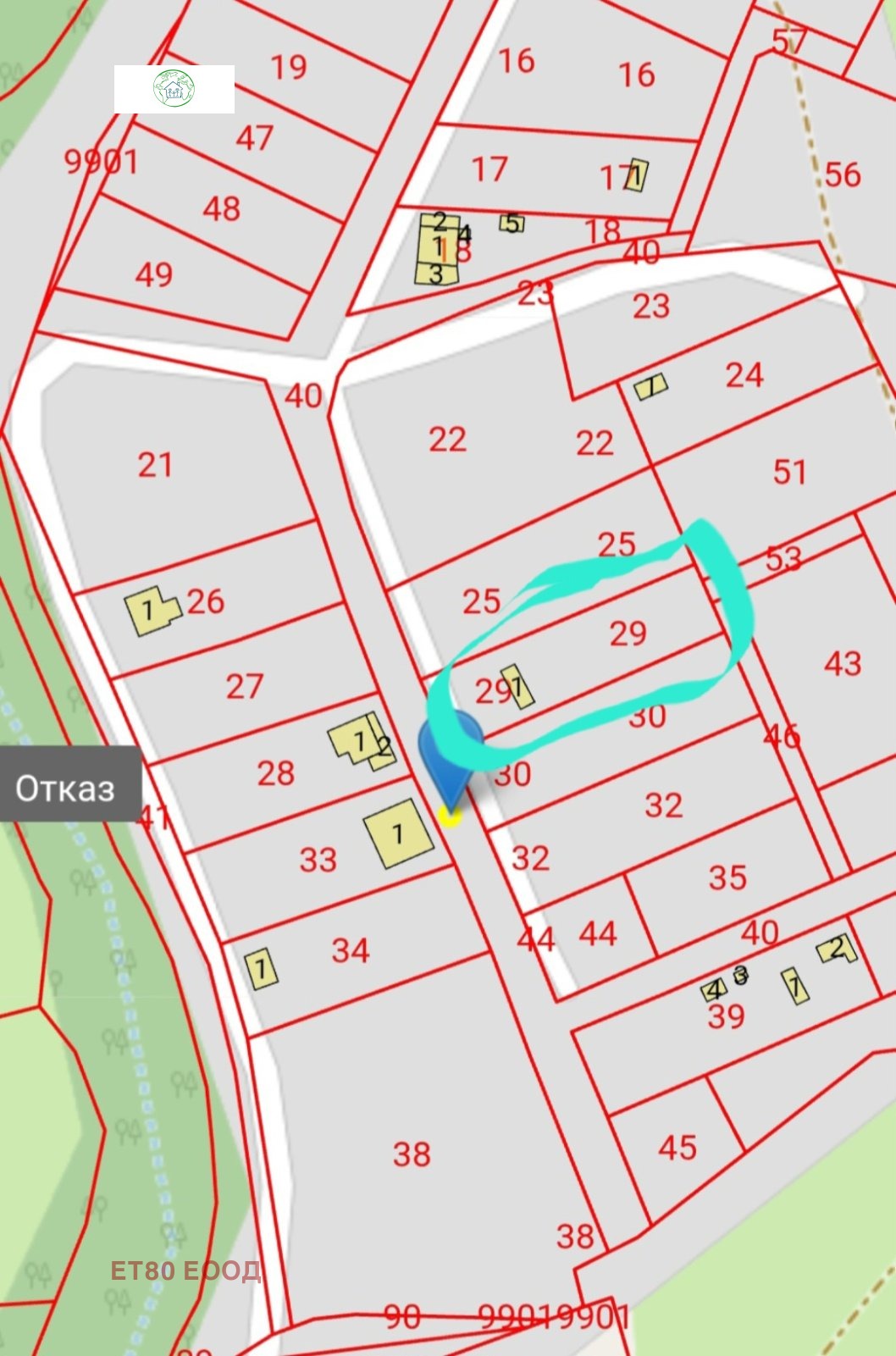 Агенция за недвижими имоти продава УПИ в с. Богьовци във вилна зона Лисия, правоъгълен парцел от 621м2 граничещ с къщи и достъп по черен път(500м). Във парцела от снимките има стар фургон, през един имот в дясно има ограден парцел, път под парцела на тясната му страна и под пътя са сградите на комшиите(виж скицата в жълто). Ток и вода, през пътя. Можем за Ваше улеснение да изпратим локацията на имота за по добър ориентир. Имотът може да бъде резервиран и свален от продажба със заплащане на депозит, след което се прекратява провеждането на огледи с други купувачи и започва подготовка на документи за сключване на предварителен и окончателен договор. Работим с всички коректни колеги по всички наши оферти. Агенцията е член на АРБИ (Асоциация за развитие на брокерите на имоти). За допълнителна информация 0882444223 Димитър Апостолов.
