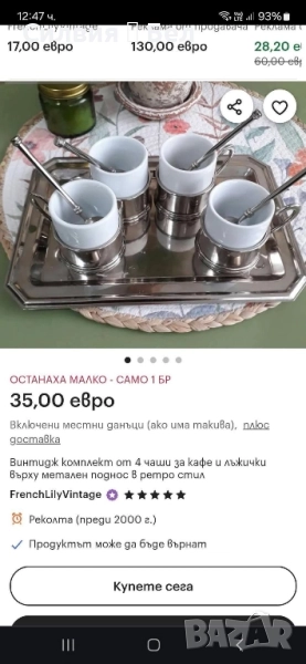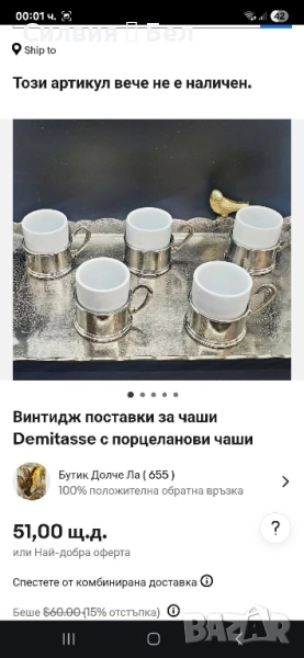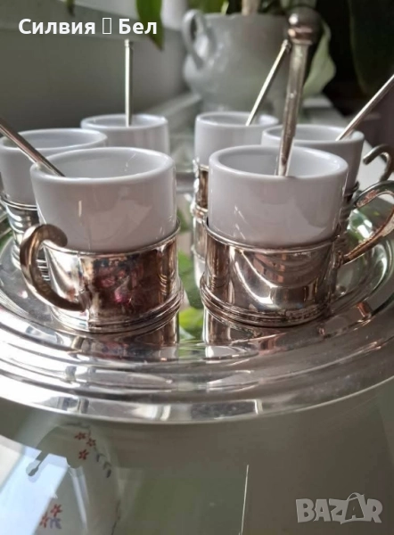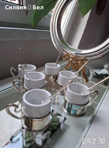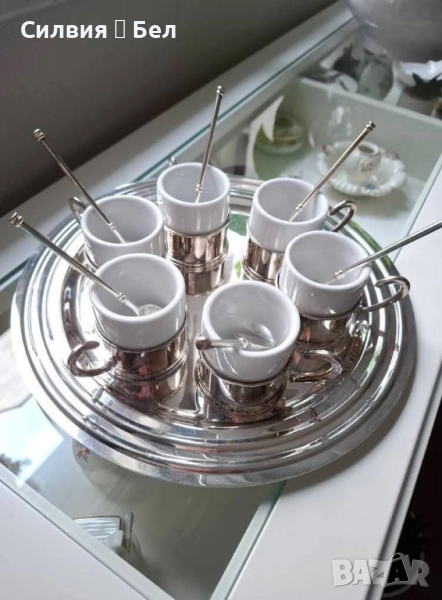 Ретро Комплект за късо кафе.. Включва: ▪︎6 порцеланови чашки за късо кафе (до 60мл.) ▪︎Подстакани в сребристо с дръжки за чашите. ▪︎Кръгъл поднос с диаметър 27,5см. ▪︎6бр. Лъжички с дължина- 11,5см. Нямат маркировки, посребрение- също. Цена 5️⃣0️⃣лв.ღꕥ⊱❥─❥⊱💜✿⊱╮☆♪ ░L░o░V░e░❥─❥⊱💜✿⊱╮💜☆♪ღ💜ღ꧂ღ