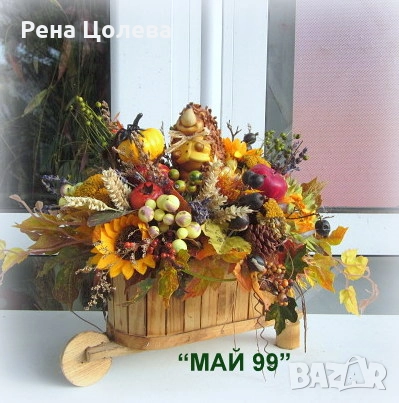 Богата есенна комозиция на дървена количка с есенни изкуствени цветя и листа,натурални и сухи треви и елементи,шишарки и плодове и керамичен таралеж!