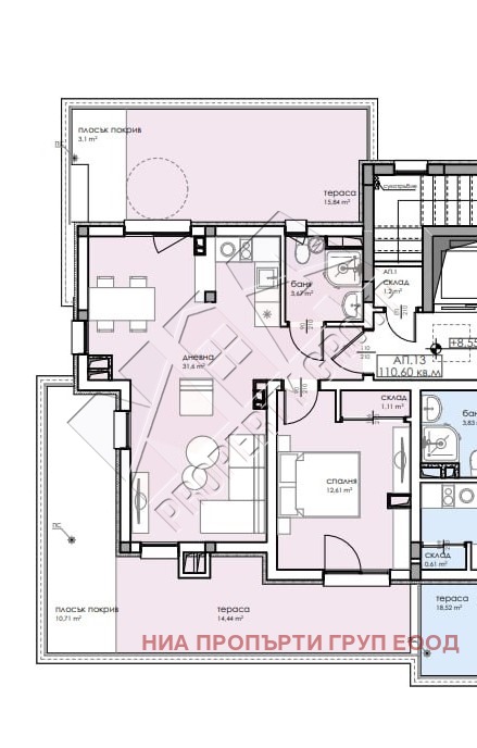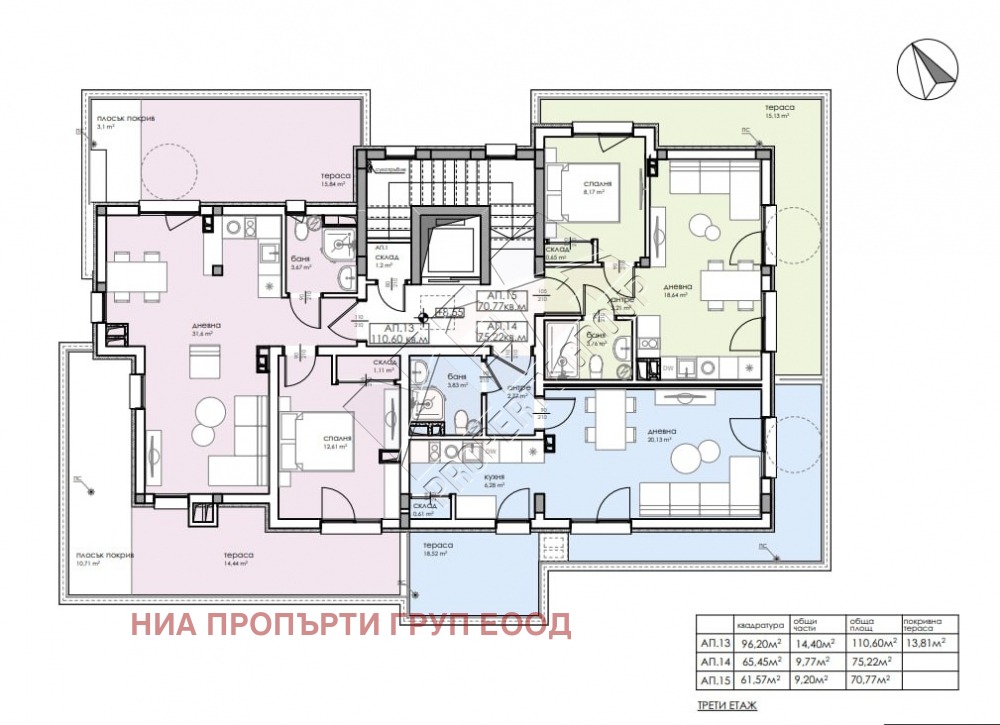 Двустаен апартамент с общата площ е 110,60 кв.м , жилищна площ 96,20 кв.м