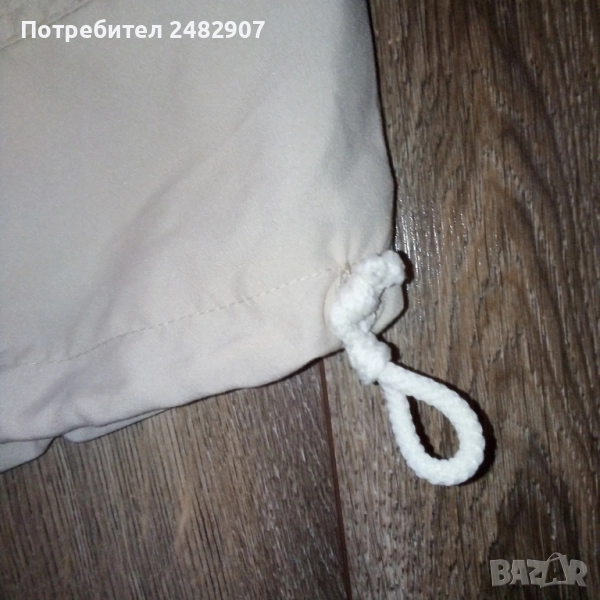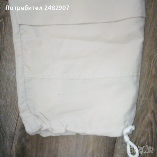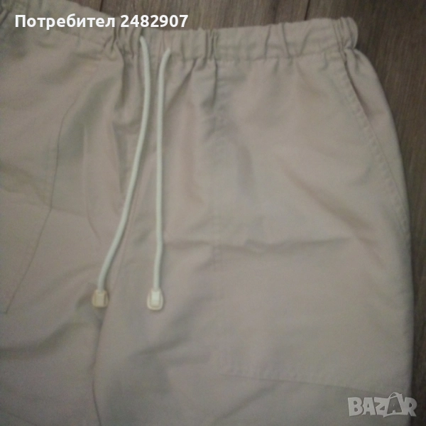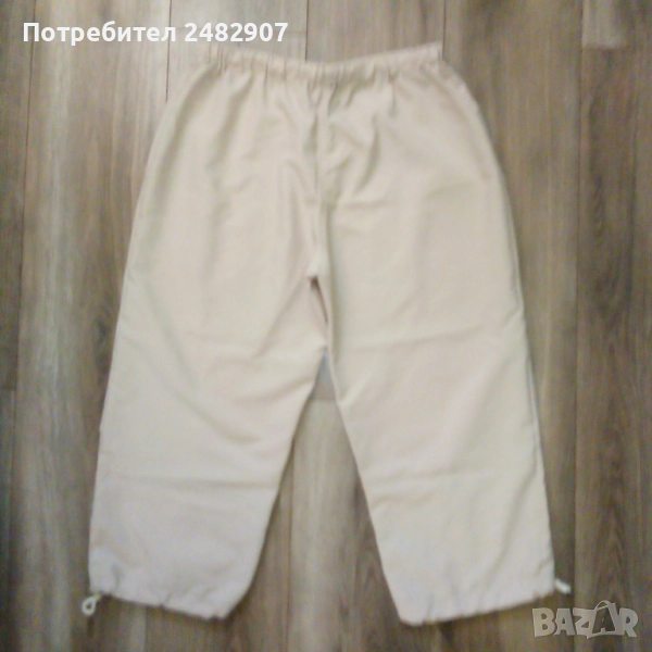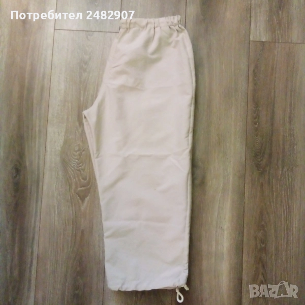 Бежов дамски 7/8 панталон с ластик в талията, джобове и връзки, размер М. Съдържа 100 % полиестер. Ширина в талията - 35 см, дължина от талията до чатала - 29 см, дължина от талията до долу - 78 см, ширина на крачола в долната част - 21 см. Чисто нов, не е използван. Ширината на крачолите в долната част може да се регулира с връзки.