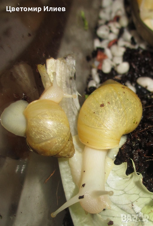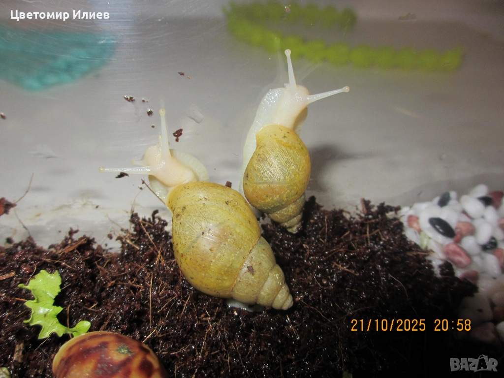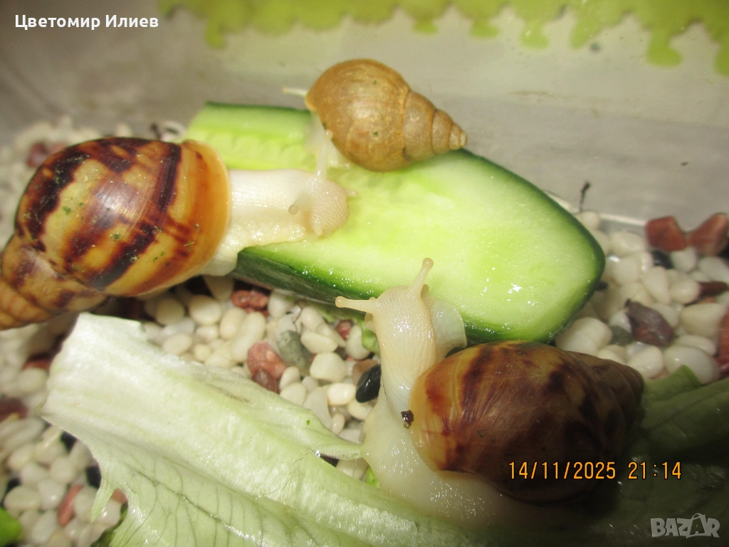 гигантски африкански охлюви. Родени са преди половин година, ядат салатки и