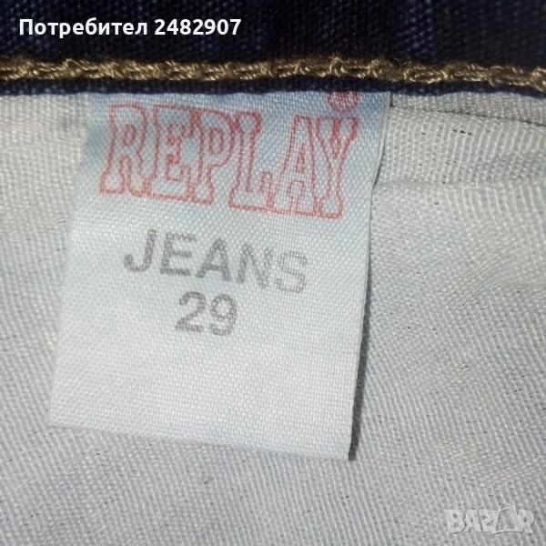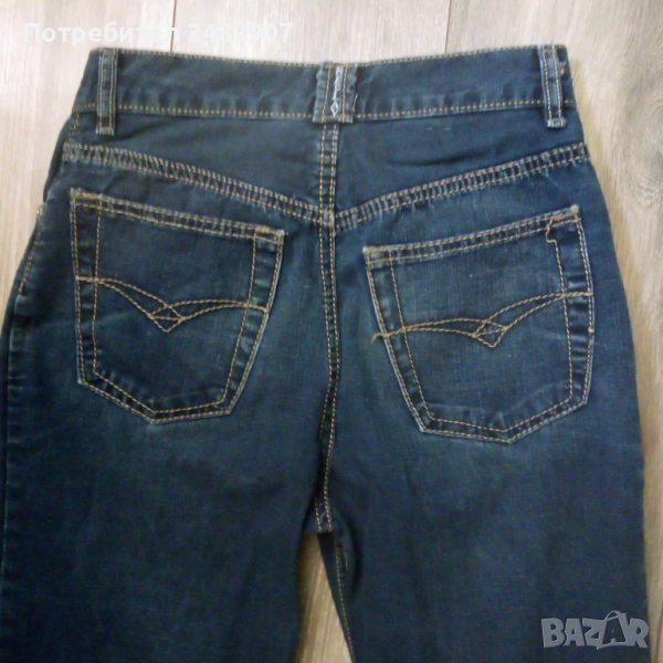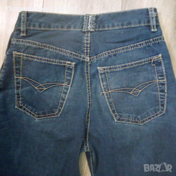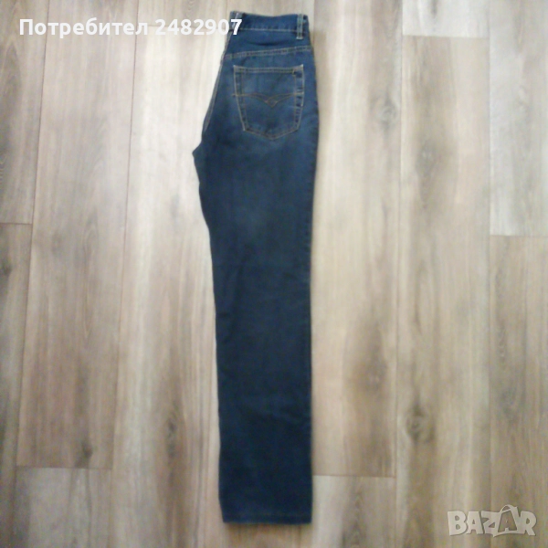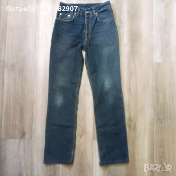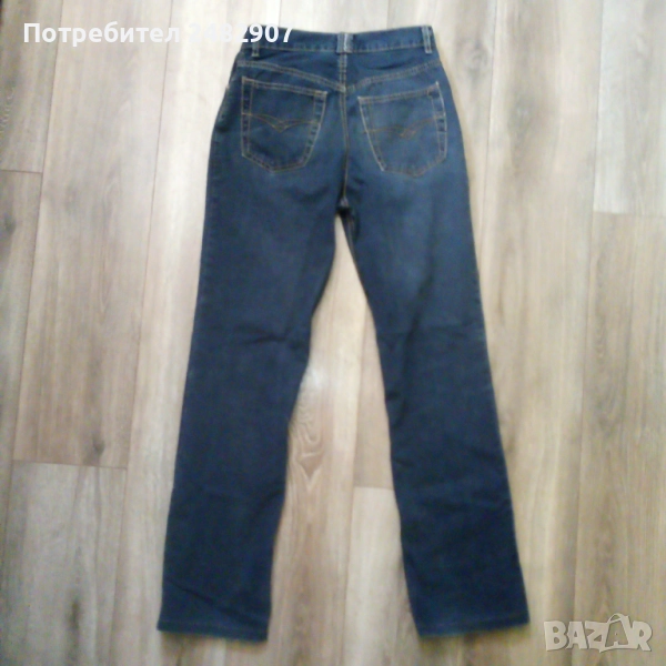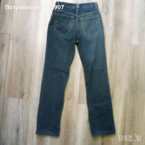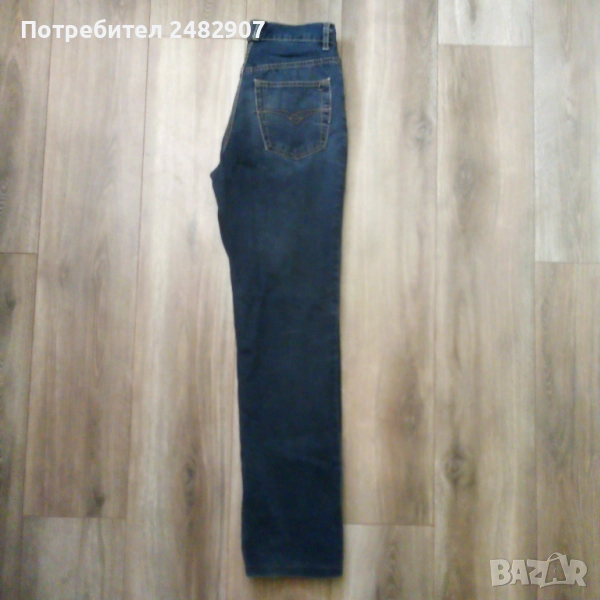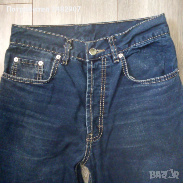 Тъмно сини мъжки дънки - ретро, размер 29. Ширина в талията - 35 см, дължина от талията до чатала - 28 см, дължина от талията до долу - 105,5 см, ширина на крачола в долната част - 20 см. Много запазени, почти не са използвани, закопчаване - с копчета отпред.
