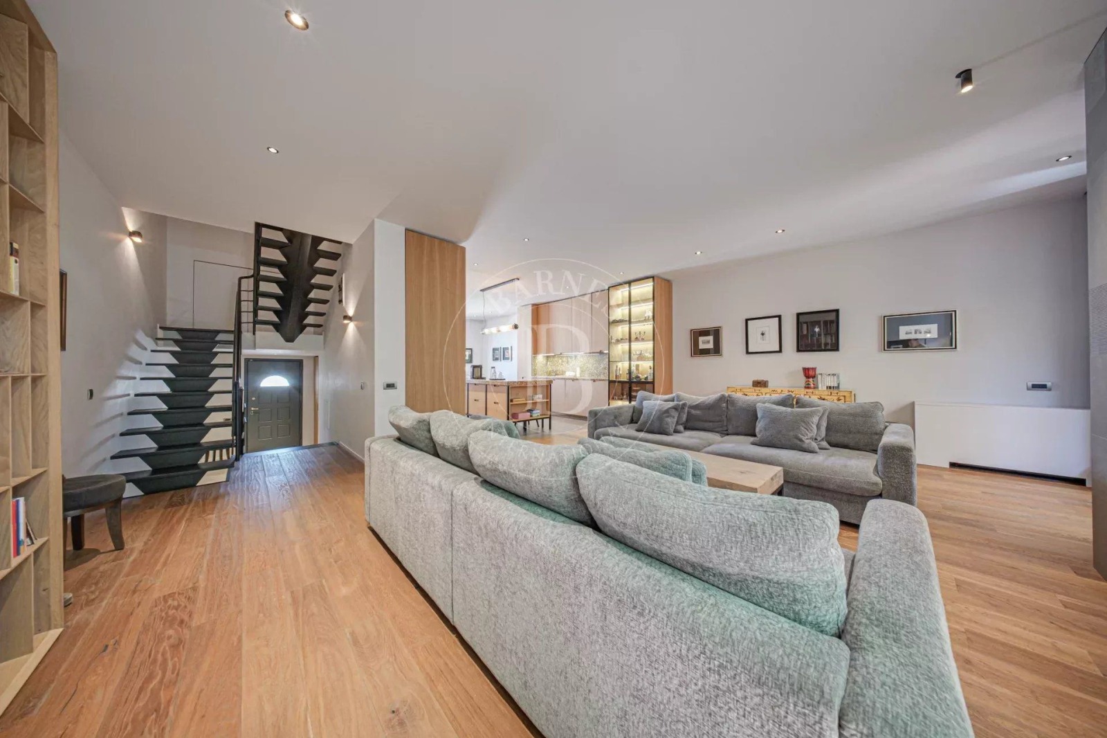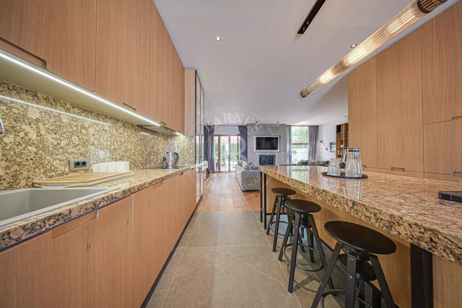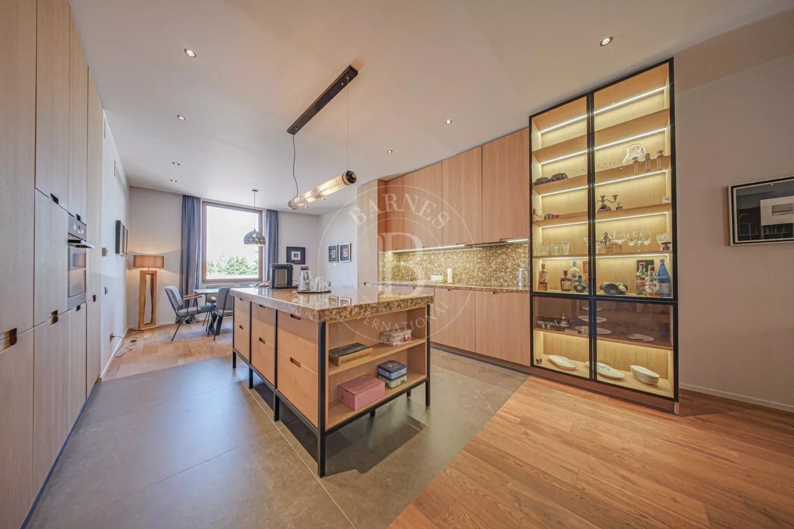 Партерният етаж е изпълнен с естествена светлина и разгръща просторна всекидневна, трапезария и кухня в отворен план. Високият клас естествени материали, топлите земни тонове и внимателно подбраните дизайнерски елементи създават атмосфера на съвършен баланс между стил и комфорт. В центъра на това пространство е разположен голям кухненски остров – истинско вдъхновение за всяко кулинарно приключение.