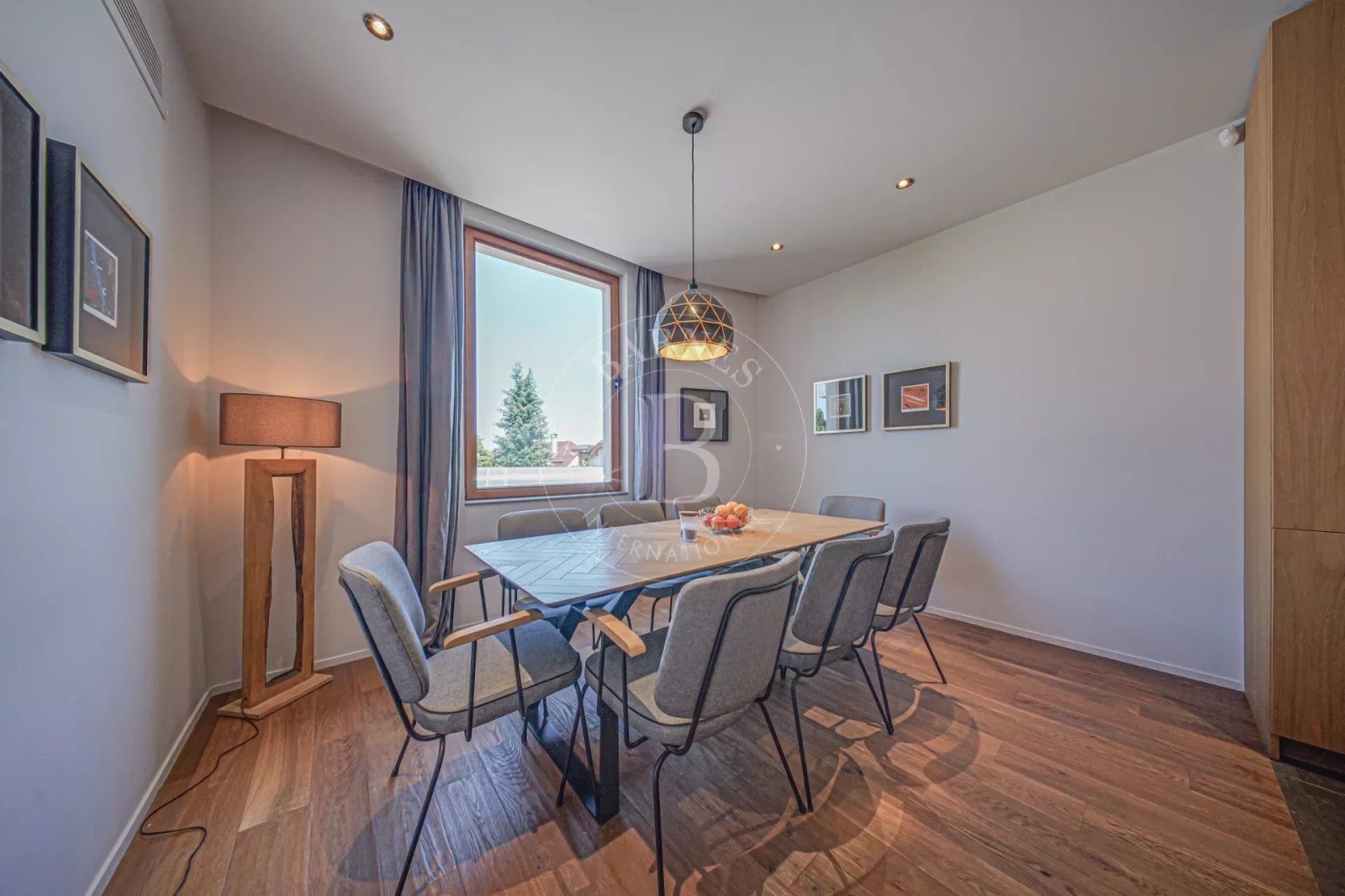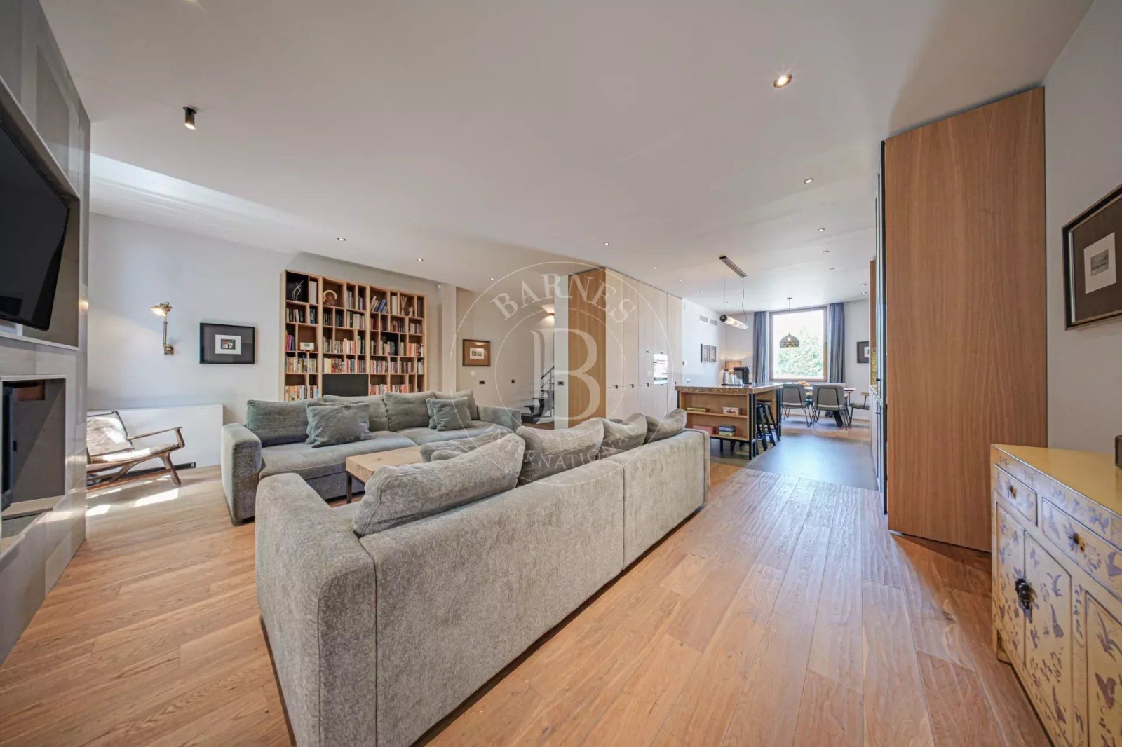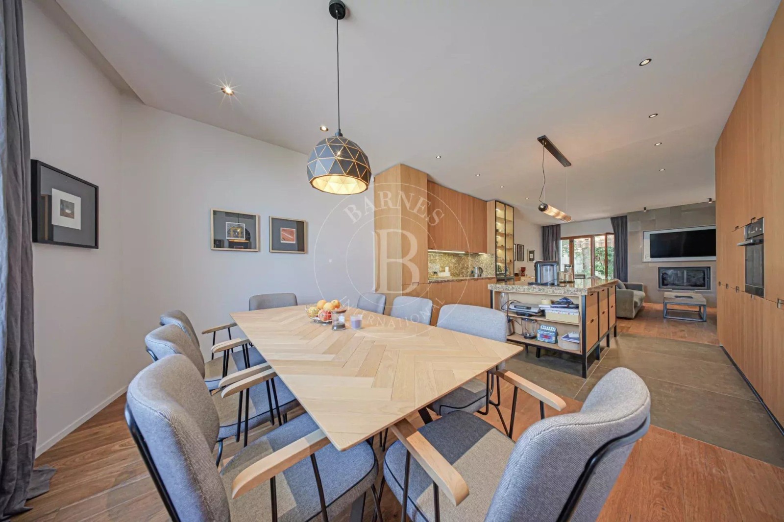 Партерният етаж е изпълнен с естествена светлина и разгръща просторна всекидневна, трапезария и кухня в отворен план. Високият клас естествени материали, топлите земни тонове и внимателно подбраните дизайнерски елементи създават атмосфера на съвършен баланс между стил и комфорт. В центъра на това пространство е разположен голям кухненски остров – истинско вдъхновение за всяко кулинарно приключение.
