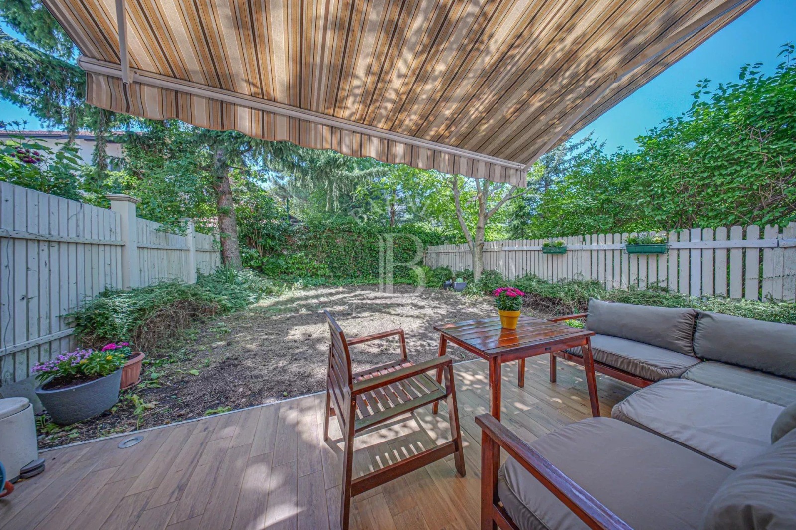 Пространството плавно преминава към покритата веранда и тихия двор, засенчен от висок бор и орех – перфектно място за сутрешно кафе или спокойни вечери на открито.