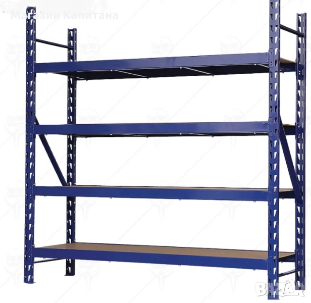 Складов метален стелаж прахово боядисан. Високо ниво на товароносимост - 800кг. на рафт ! Осигурени пинове за гредите и пети за анкериране. Подпорни греди с болтово присъединяване. Дъната на рафтовете, са изработени от ПДЧ с дебелина 7мм.