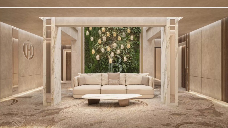Елегантно лоби, покрито с естествен мрамор, обзаведено с мека мебел от Bentley Home, с акценти от озеленени абажури и ефектна камина;