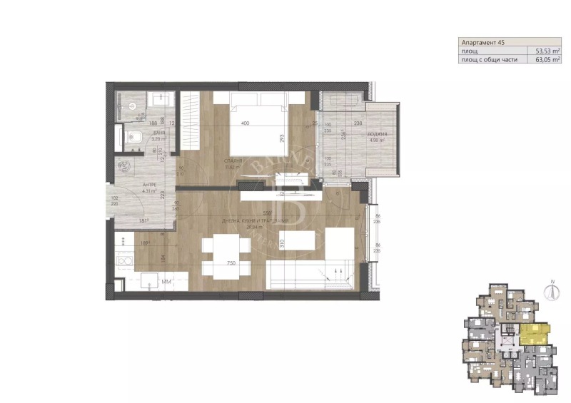 Двустайният апартамент е с обща площ 63.05 кв.м (нетна площ 53.53 кв.м + общи части 9.52 кв.м).