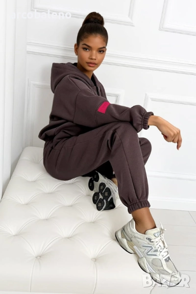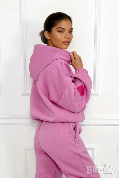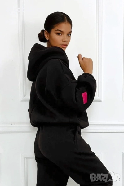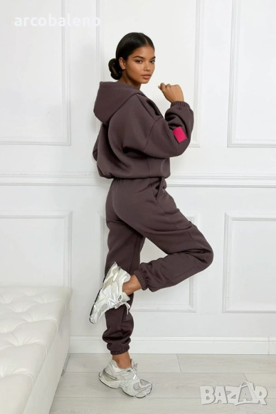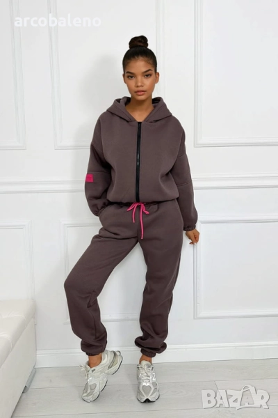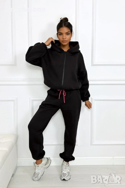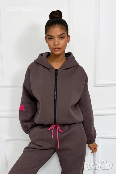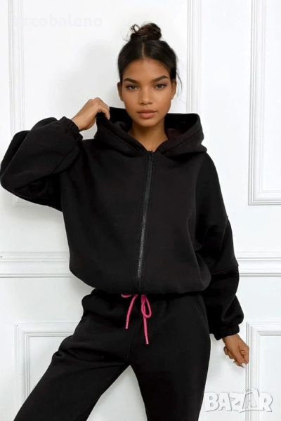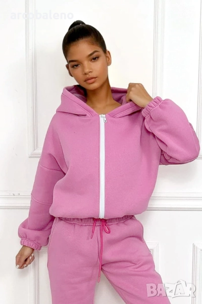 Този комплект е перфектната комбинация от комфорт и стил. Топъл, мек отвътре и удобен за носене, той е едновременно практичен и модерен благодарение на суитшърта с цип и фините акценти в ярък цвят фуксия. Можете да го носите като цяло или да комбинирате отделни части с други, за да създадете разнообразни удобни, градски визии.