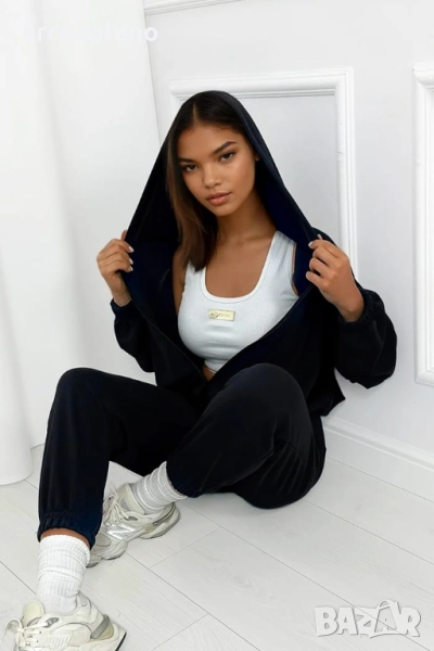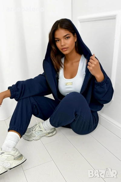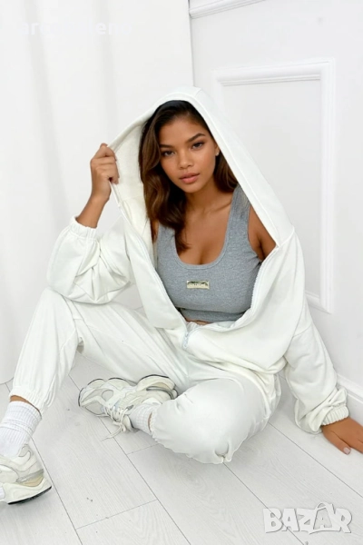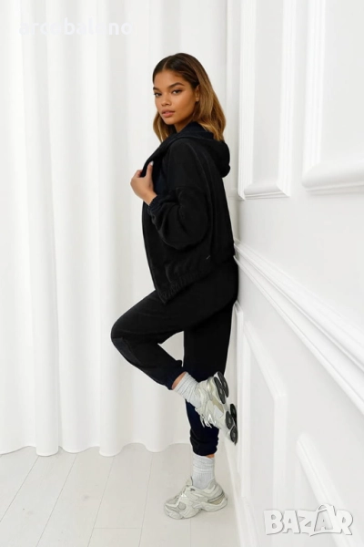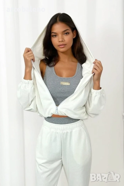 Комплектът е изработен от първокласен суитчър плат – дебел, плътно тъкан и богат на допир, съчетаващ богатство, плътност и изключителна мекота . Богат на допир, кадифен и еластичен, платът се спуска красиво по тялото, подчертавайки естествените му извивки и осигурявайки пълен комфорт. Платът е изключително приятен за кожата, еластичен и гъвкав .