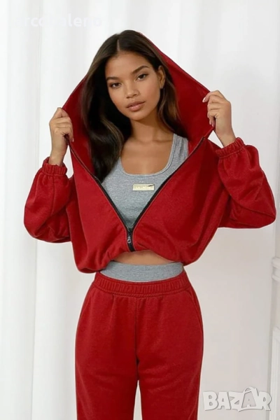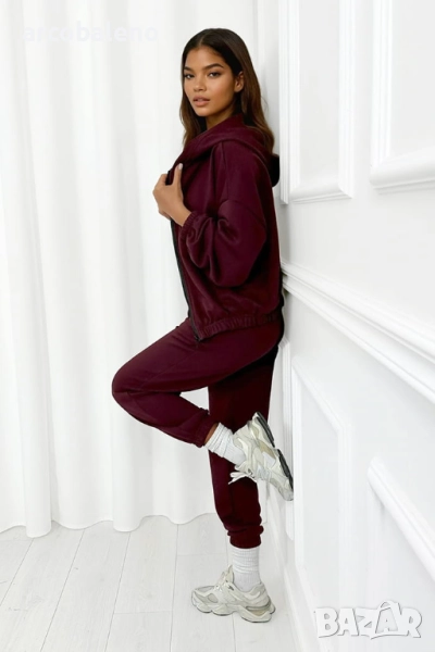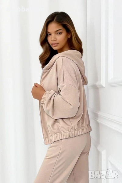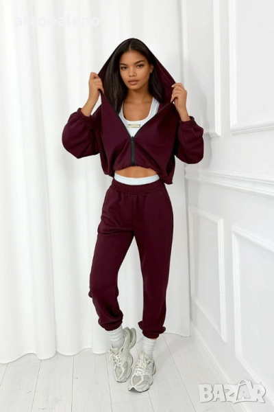 Комплектът е изработен от първокласен суитчър плат – дебел, плътно тъкан и богат на допир, съчетаващ богатство, плътност и изключителна мекота . Богат на допир, кадифен и еластичен, платът се спуска красиво по тялото, подчертавайки естествените му извивки и осигурявайки пълен комфорт. Платът е изключително приятен за кожата, еластичен и гъвкав .
