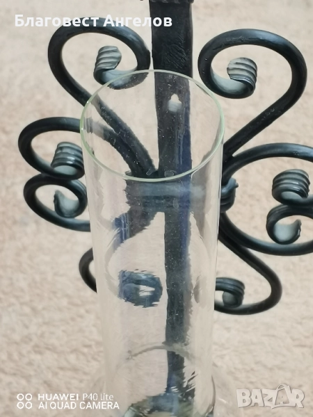 Стъклена газена лампа, височина 39 см. Стойката за стена е правена допълнително.