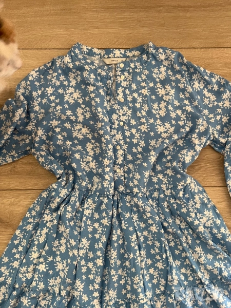 Роклята е силно разкроена, с вдигната талия. Може да се носи свободно или с колан. Приятна памучна материя, без еластичност.