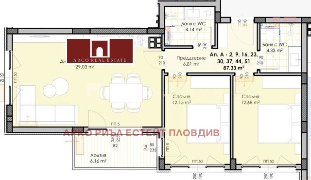 ARCO REAL ESTATE представя тристаен апартамент в строеж в луксозна нова сграда. Жилището разполага с просторна дневна, две спални,две бани с тоалетна, склад вътре в апартамента и тераса с гледка към Стара Планина на изток.