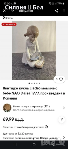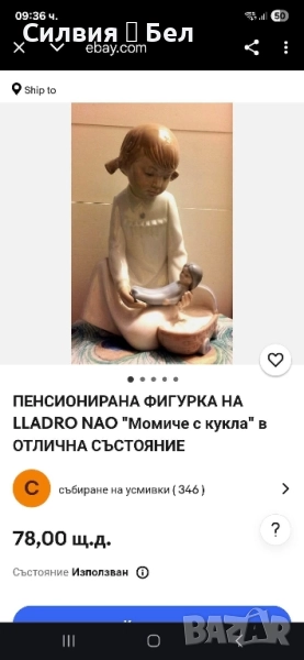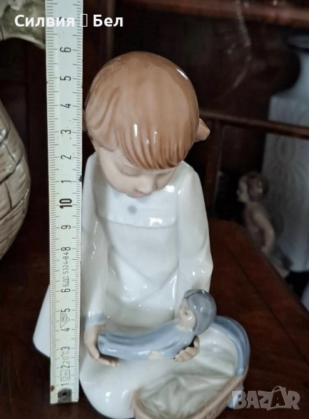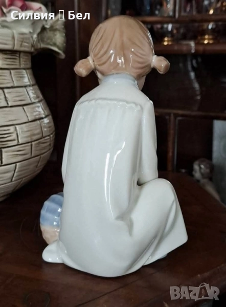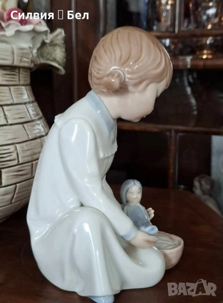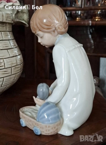 Изящна ретро порцеланова фигура, изработена от световноизвестната испанска марка Nao by Lladro. Представлява малко момиченце, нежно поставящо кукла-бебе в малка количка. Изпълнена в типичните за Nao пастелни тонове – меко бяло, бледо синьо и кафеникаво за косата.