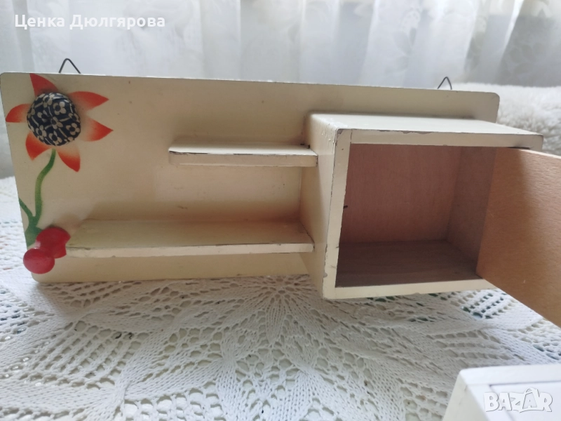 Винтидж дървена стенна кутия за аксесоари за шиене от 70-те години. Състояние нова. Ръчно рисувана. Има игленик, рафтове и малко долапче с вратичка за макари.