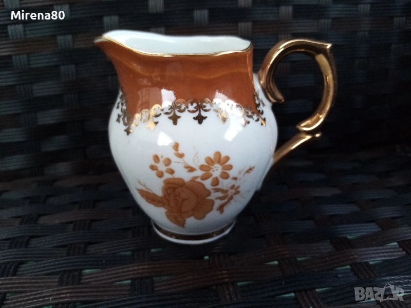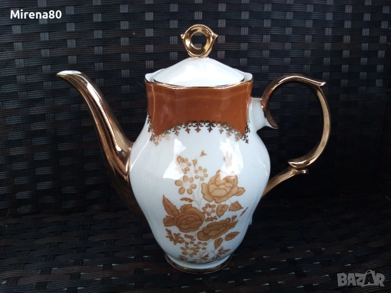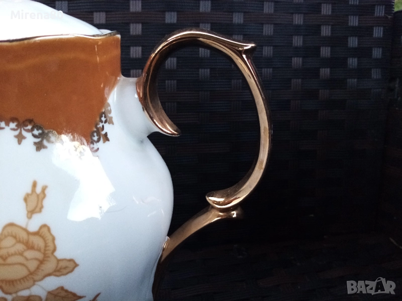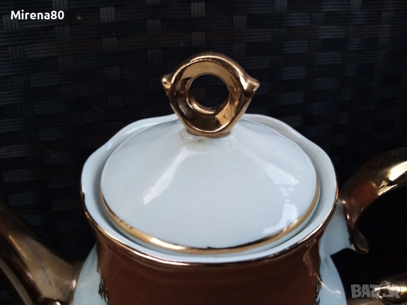 костен порцелан, с богата декорация в цвят мока с много позлата. Бароков дизайн, дръжките са целите в златна баня. Много елегантен и красив на живо ! Отлично състояние (единствено капачето на чайника има лека неравност - снимана). Маркировка за произход.