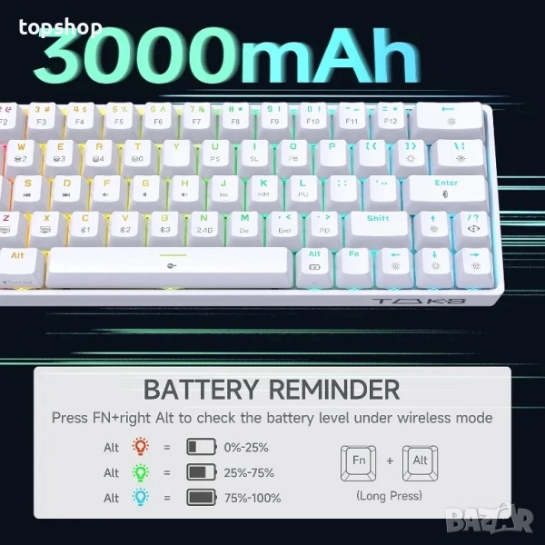 НОВА, ТЕСТВАНА Геймърска клавиатура TMKB T63, механична, безжична с Bluetooth донгъл, бяла...