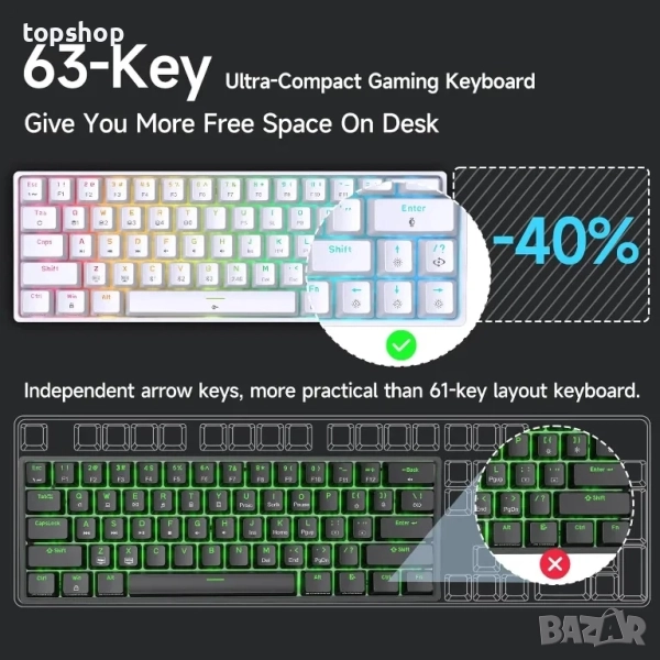 Опростен дизайн: T63 е компактна механична клавиатура с 63 клавиша, където всички функции се изпълняват чрез комбинирания бутон "FN", за да се запазят всички функции, като същевременно се освобождава повече място на бюрото.