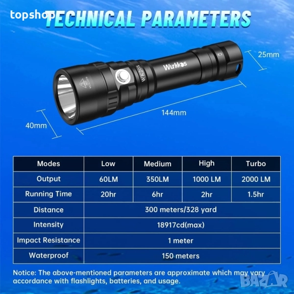 【Професионално водоустойчиво фенерче IPX8】Оценено за дълбочина до 150 метра, това водоустойчиво фенерче е с двойни О-пръстени и прецизно уплътнение, за да издържи на високо налягане. Всеки модул е тестван за течове, за да се гарантира надеждна работа в трудни подводни условия.