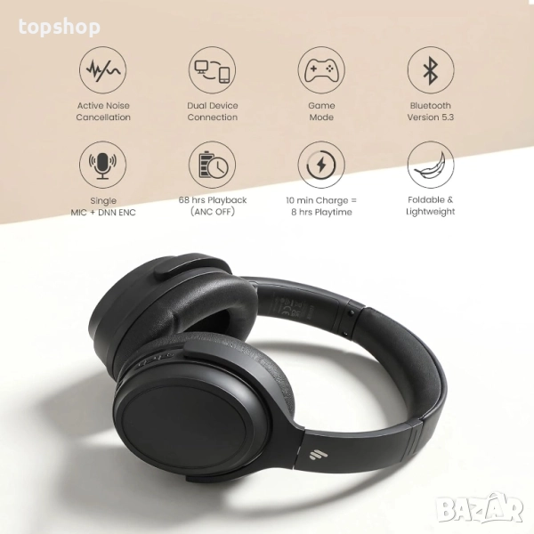 УЛТРА-ДЪЛГО ВЪЗПРОИЗВЕЖДАНЕ - Насладете се на до 68 часа възпроизвеждане с изключено ANC и впечатляващите 45 часа с включено ANC. Плюс това, получете 8 часа слушане само с бързо 10-минутно зареждане.
