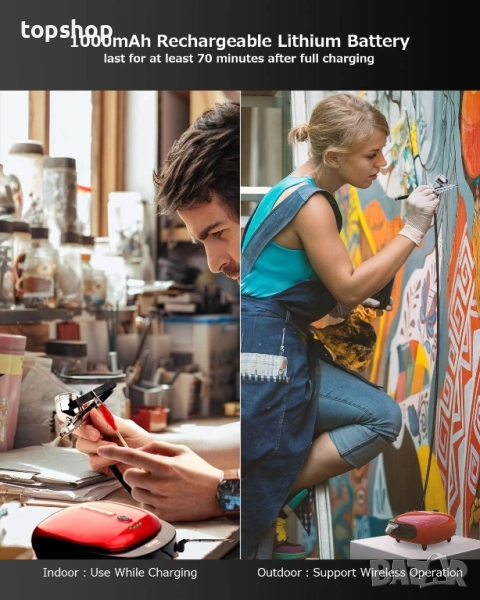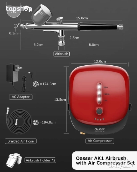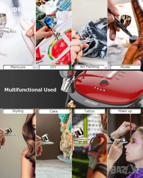 Многофункционален и с множество аксесоари - Този аерограф с мини компресор е интелигентен инструмент за оцветяване за повечето задачи, свързани с пръскане, боядисване и аерограф, помага ви да бъдете по-ефективни с времето си и да свършите повече за по-малко време. Перфектен за рисуване на изкуство, оцветяване на модели, занаяти, „Направи си сам“, грим, декорация на торти, ноктопластика и т.н. Много подходящ за начинаещи и любители на оцветяването. Предлага се с различни аксесоари, може да задоволи всички ваши нужди.
