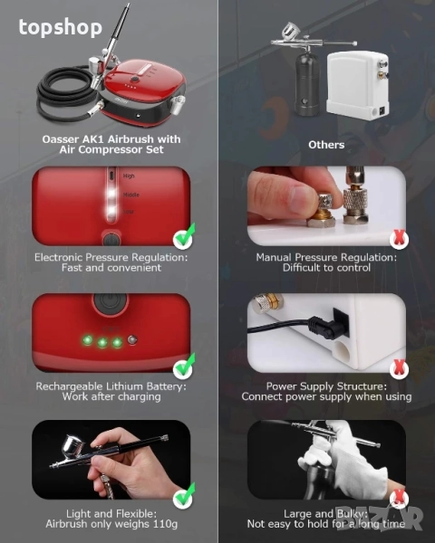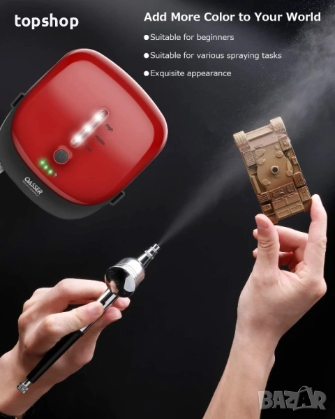 Комплект за аерограф Oasser, компресор, ръчен с двойно действие, литиева батерия, авто спиране с LED