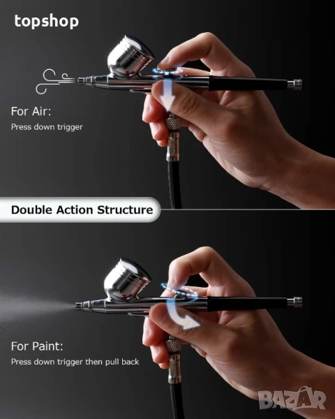 Отлични характеристики на боядисване - Тази аерограф система, изработена от прецизни компоненти, които позволяват на аерографа да работи ефективно, осигурява изключително разпръскване, избягвайки разлика в цветовете. Двойното действие на спусъка контролира както въздуха, така и цвета, позволява промяна на ширината на линията и количеството на пръскане чрез завъртане на регулируемия винт в задната част, така че да се постигне точен контрол на пръскането. Лесен за работа. С ергономичен дизайн, удобен за хващане.
